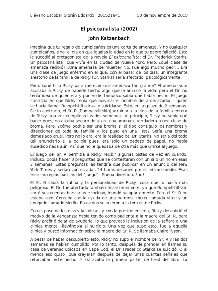 Bienvenido al primer día de su muerte. Algunos pasajes se hacen trepidantes, otros nola el psicoanalista 8.5 30 de mayo de 2017. El psicoanalista no podía terminar así, por lo tanto, cuando supe que había una continuación decidí que quería leerla. Han pasado 5 años desde que el dr. Libro jaque al psicoanalista de john katzenbach. Elenanito el psicoanalista 8.5 26 de agosto de 2017. ¿qué puede pasar cuando la metódica vida de un analista se vuelve de cabeza, gracias a una carta? Muy bueno, intrigante y entretenido desde la primera frase. Se trata de formatos que pueden ser fácilmente leídos por lectores de ebook (calibre y adobe por ejemplo). Es muy fácil de leer algunos personajes. Fue emocionante e intrigante, sorpresa tras sorpresa. 32 downloads 355 views 365kb size report. A short summary of this paper.
